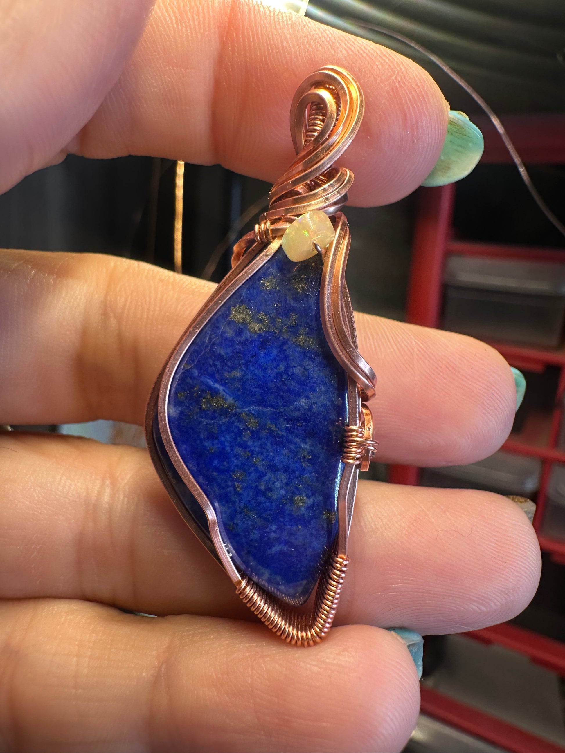 Lapis wrapped in Raw copper and comes with black cord and label about the stone