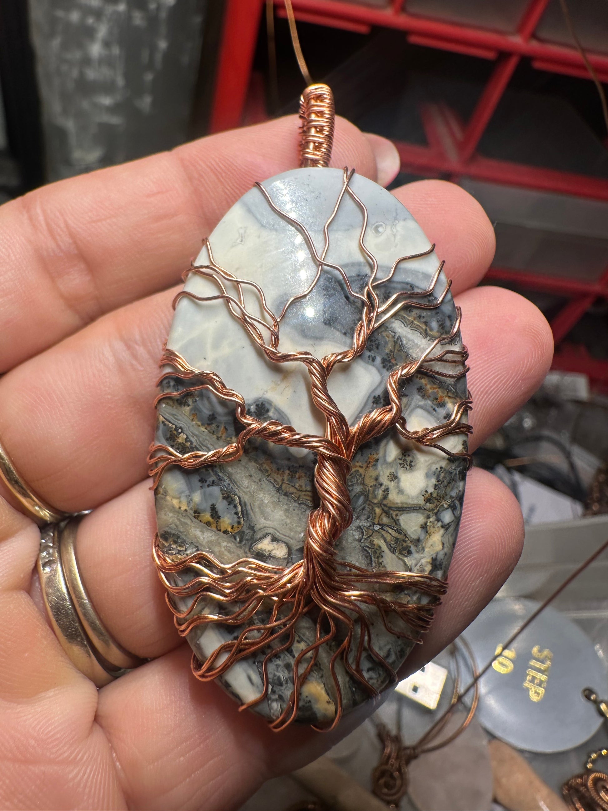 Maligano jasper cabochon wrapped in copper wire comes with 20” black cord and label about the stone