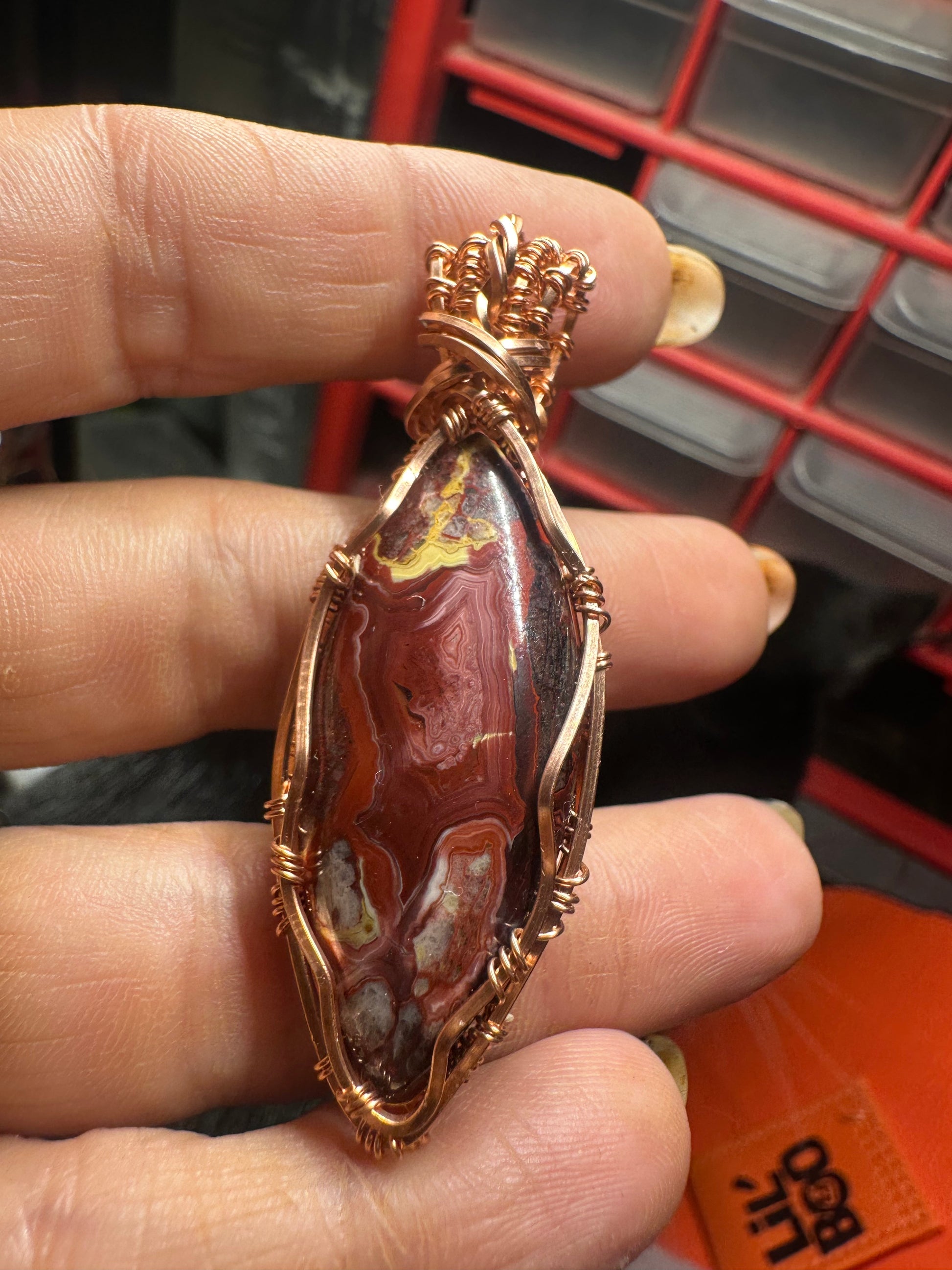 Lace Red Agate wrapped in warm raw copper.