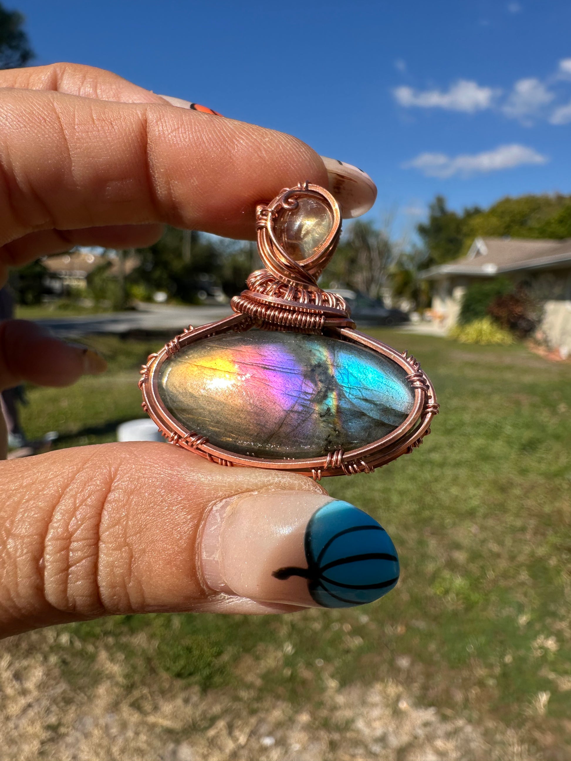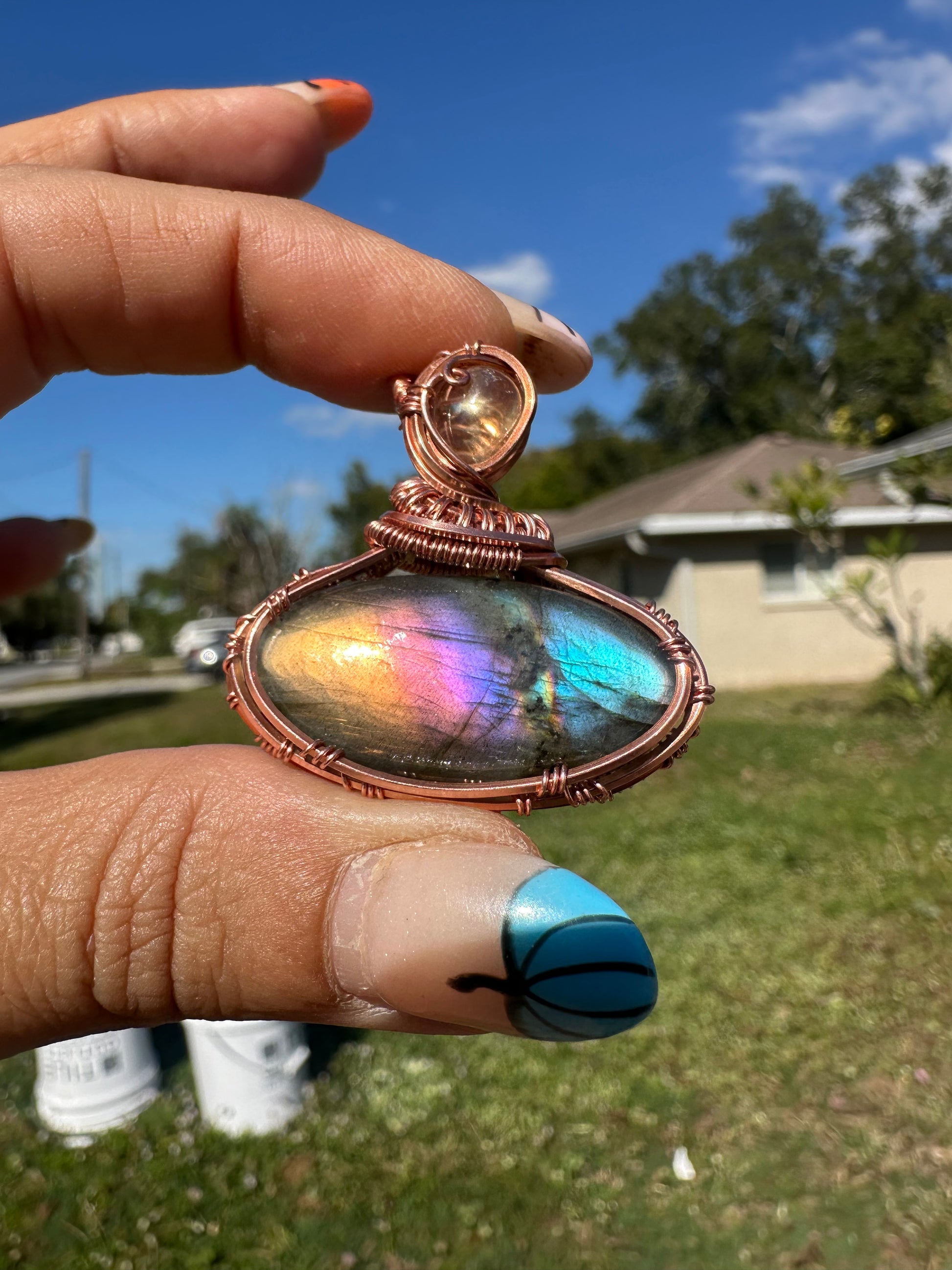 gorgeous rainbow spectrolite and yellow topaz stones wrapped in raw copper wire